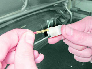 3. Помечаем на колодке цвет проводов. Отверткой с тонким лезвием или большой канцелярской скрепкой поджимаем стопорные усики наконечников проводов и вынимаем наконечники из соединительной колодки.