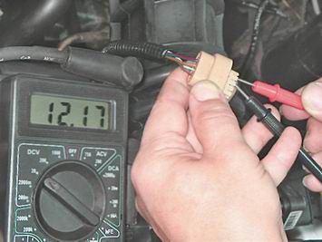 5. Включив зажигание, мультиметром в режиме вольтметра измеряем напряжение между выводами С и D колодки жгута проводов.