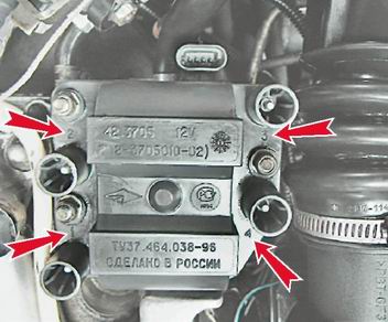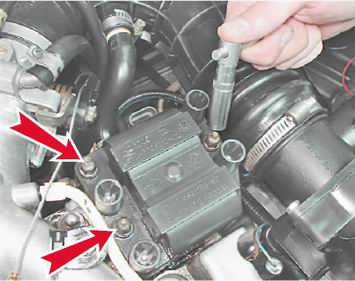 6. При выключенном зажигании, торцовым ключом на 10 мм с глубокой головкой отворачиваем три гайки крепления модуля зажигания.
