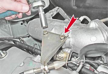 2. Торцовым ключом на 10 мм отворачиваем два болта крепления кронштейна троса привода дроссельной заслонки.