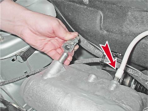 4. Ослабив затяжку хомута, снимаем со штуцера шланг вакуумного усилителя тормозов. Отсоединяем от ресивера шланг регулятора давления топлива.