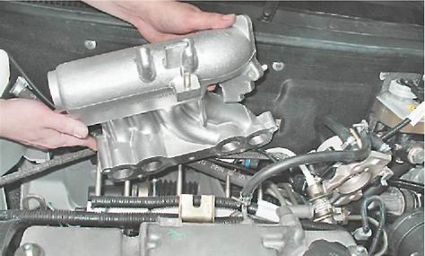 1. Снимаем дроссельный узел со шпилек фланца ресивера, не отсоединяя от него шланги системы охлаждения (см. "Дроссельный узел - снятие, замена прокладки и установка").