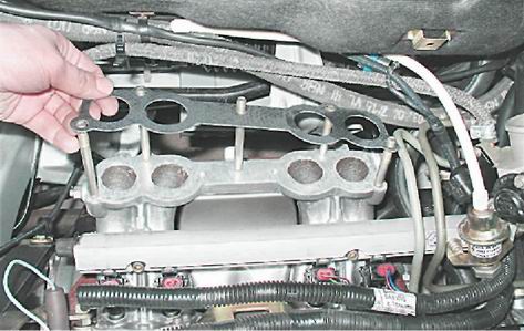 9. Снимаем со шпилек впускного трубопровода уплотнительную прокладку. Поврежденную прокладку заменяем.