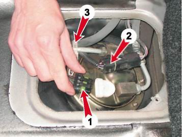 3. Освободив фиксатор, отсоединяем колодку жгута проводов (1) от топливного модуля. Разъединяем колодку жгута проводов (2).