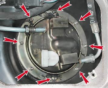 7. Торцовым ключом на 7 мм отворачиваем восемь гаек крепления топливного модуля.