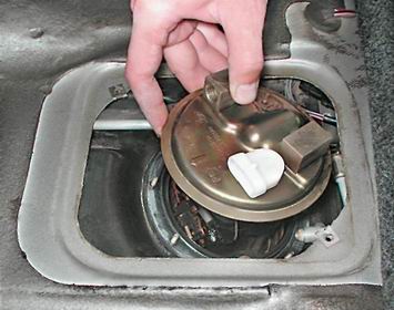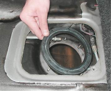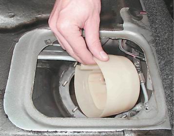Предупреждение! Вынимая топливный модуль, не погните рычаг датчика указателя уровня топлива. Для этого слегка наклоните модуль и аккуратно выведите поплавок из отверстия бака Замечание. Как правило, не удается вынуть топливный модуль в сборе с заборной камерой (пластмассовой емкостью, закрепленной при помощи двух резиновых втулок на направляющих крышки топливного модуля) и камера остается в баке. 10. Снимаем резиновую уплотнительную прокладку. Поврежденную уплотнительную прокладку заменяем.