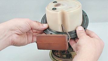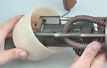 3. Вставляем бензонасос в камеру (втулки должны войти в отверстия приливов кожуха бензонасоса)...