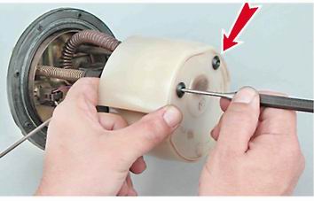 Установка Рекомендация. Устанавливать топливный модуль в бак следуете сборе с заборной камерой. 1. Отверткой извлекаем две резиновые втулки из отверстия в приливах кожуха топливного насоса.