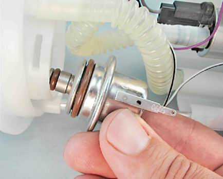 Проверить работу регулятора давления топлива можно, не снимая его с автомобиля (см. "Топливная рампа - проверка рабочего давления"). Неисправный регулятор давления заменяем. Снятие
