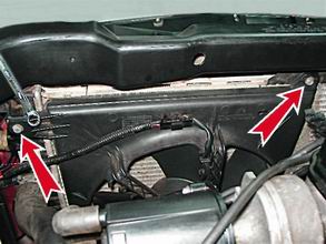 Электровентилятор системы охлаждения - снятие и установкаЭлектровентилятор системы охлаждения предназначен для увеличения потока воздуха, проходящего через теплообменную решетку радиатора, что способствует более интенсивному рассеиванию тепла в окружающие пространство. Необходимость в замене электровентилятора возникает в случае, когда двигатель перегревается, особенно в режиме холостого хода, а вентилятор не включается. Замечание: Если электровентилятор не работает, не спешите его снимать. Чаще всего неисправен не сам вентилятор, а его электропроводка. Предварительно проверьте электропроводку и работоспособность вентилятора и только после этого принимайте решение о снятии вентилятора. Степень сложности: 2. 1. Надежно устанавливаем автомобиль на ровной площадке (см. "Стандартные операции"). 2. Отсоединяем провод от отрицательного вывода аккумуляторной батареи (см. "Стандартные операции"). 3. Разъединяем электрический разъем мотора вентилятора (см. "Радиатор системы охлаждения двигателя - снятие и установка" п. 8). 4. Если автомобиль оборудован кондиционером, отсоединяем крепление ресивера-осушителя и, не отсоединяя шланги хладагента от ресивера, сдвигаем ресивер в сторону. 5. Накидным ключом на 10 откручиваем 2 болта крепления кожуха вентилятора к радиатору и снимаем вентилятор вместе с кожухом.