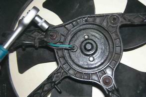 7. Если необходимо заменить мотор или крыльчатку вентилятора, то торцовым ключом на 10 откручиваем гайку крепления крыльчатки к оси мотора.