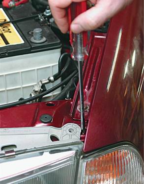 4. Торцовым ключом на 10 с трещоткой и удлинителем откручиваем 2 самореза верхнего крепления фары.