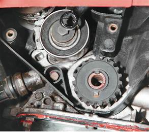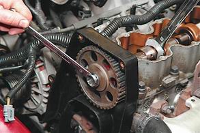 6. Рожковым ключом на 22 удерживаем распределительный вал за шестигранный участок от проворачивания. Одновременно торцовой головкой на 17 откручиваем болт крепления зубчатого шкива распределительного вала.