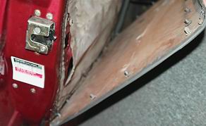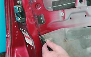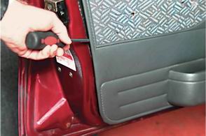 8. Шлицевой отверткой, начиная снизу, выдергиваем пластиковые пружинные держатели обивки из отверстий в панели двери.