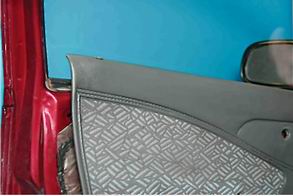 Продев конец тяги замка в отверстие обивки, и совместив пружинные фиксаторы обивки с отверстиями в двери, устанавливаем обивку, вдавливая фиксаторы в отверстия панели двери.