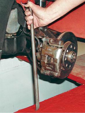Передние тормозные колодки - заменаТормозные колодки меняются только комплектом одновременно на обоих передних колесах. Для правильной притирки колодок избегайте резких торможений первые 200-300 км после замены колодок. Степень сложности: 2. Замечание: Для замены тормозных колодок смотровая яма желательна, но не обязательна, заменить колодки можно и на ровной площадке. 2. Снимаем колесо (см. "Стандартные операции"). 3. При помощи монтажной лопатки или другого рычага утапливаем поршень в тормозной цилиндр.