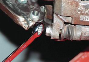 4. Ключом на 14 откручиваем нижний болт крепления подвижной скобы суппорта.