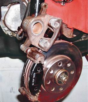 7. Утапливаем поршень в корпус цилиндра до упора и устанавливаем новые колодки. 8. Ставим на место подвижную скобу суппорта и закручиваем нижний болт крепления. 9. Устанавливаем колесо на место и баллонным ключом закручиваем болты крепления колес. 10. Снимаем автомобиль с подставки и окончательно затягиваем болты крепления колес моментом затяжки 90 Н·м. Предупреждение: Перед началом движения после замены тормозных колодок для их правильной установки и ликвидации образовавшихся зазоров необходимо несколько раз нажать на педаль тормоза, пока тормозная педаль не поднимется до своего нормального положения. |