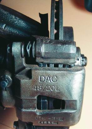 Передние тормозные механизмы - проверка состоянияСтепень сложности: 2. 1. Надежно устанавливаем автомобиль на смотровую яму или эстакаду (см. "Стандартные операции"). 2. Снимаем передние колеса и устанавливаем переднюю часть автомобиля на надежные подставки (см. "Стандартные операции"). 3. Через окно тормозного суппорта визуально проверяем толщину и равномерность износа передних колодок.