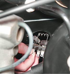 Плата добавочных сопротивлений электрического двигателя вентилятора - снятие и установкаСтепень сложности: 2. 1. Надежно устанавливаем автомобиль на ровной площадке (см. "Стандартные операции"). 2. Отсоединяем провод от отрицательного вывода аккумуляторной батареи (см. "Стандартные операции"). 3. Отсоединяем разъем платы гасящего сопротивления мотора вентилятора.