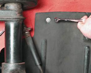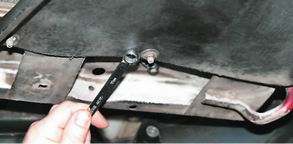 7. Накидным ключом на 10 откручиваем 2 болта бокового крепления грязезащитного щитка.