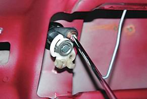 4. Отсоединяем пластмассовый фиксатор и выводим тягу электропривода замка крышки багажника из отверстия качающегося рычага.