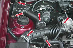 Регулировка натяжения ремня генератораСтепень сложности: 2. Предупреждение: При регулировке нельзя перетягивать ремень генератора, так как это может привести к выходу из строя как ремня, так и самого генератора. Последовательность выполнения операций: 1. Надежно устанавливаем автомобиль на ровной площадке (см. "Стандартные операции"). 2. Отсоединяем провод от отрицательного вывода аккумуляторной батареи (см. "Стандартные операции"). 3. Для удобства работы снимаем центральный воздуховод и резонатор системы впуска. Шлицевой отверткой ослабляем затяжку хомутов четырех патрубков центрального воздуховода, затем рожковым ключом на 10 откручиваем саморез и гайку крепления резонатора центрального воздуховода, после чего снимаем воздуховод и резонатор.