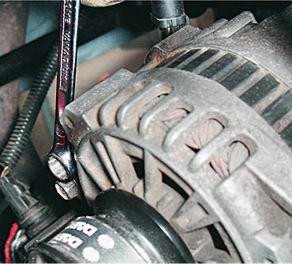 7. Накидным ключом на 12 затягиваем фиксирующий болт. 8. Проводим проверку натяжения ремня генератора (см. выше). 9. Накидным ключом на 12 затягиваем гайки нижних осевых болтов генератора. |
