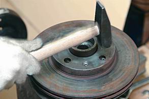 3. Если тормозной диск не поддается снятию от руки, обстукиваем его молотком по поверхности, не соприкасающейся с тормозными колодками.