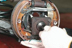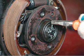 Ступица и цапфа заднего колеса - снятие и установкаСтепень сложности: 2. 1. Выполняем подготовительные и основные операции по снятию тормозного барабана (см. "Тормозной барабан - снятие и установка"). 2. При помощи пассатижей pacшплинтовываем корончатую гайку ступицы заднего колеса.