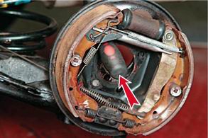 6. Для удерживания тормозного механизма вставляем отвертку подходящего диаметра в отверстие верхнего левого болта.