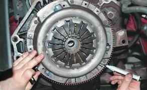 4. Полностью откручиваем 4 болта крепления корзины сцепления и, отодвинув корзину сцепления от маховика, снимаем ведомый диск сцепления.