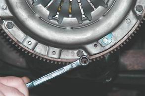 3. Накидным ключом на 11 за несколько проходов, не более чем по 1/2 оборота за один раз, в очередности "крест-накрест", ослабляем затяжку 6 болтов крепления корзины сцепления. Для удержания маховика от проворачивания используем большую шлицевую отвертку.