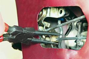 3. Шлицевой отверткой или круглогубцами выводим из фиксатора замка тягу ручки двери.