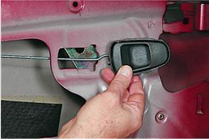 4. Выводим тягу из держателя, закрепленного в панели двери.