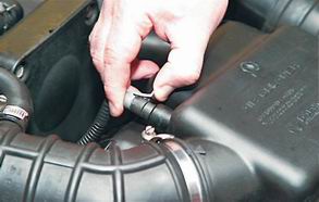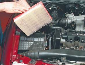 Воздушный фильтр - замена фильтрующего элементаСтепень сложности: 1. 1. Надежно устанавливаем автомобиль на ровной площадке (см. "Стандартные операции"). 2. Подняв скобу фиксации, отсоединяем электрический разъем датчика температуры воздуха на впуске.