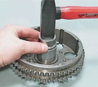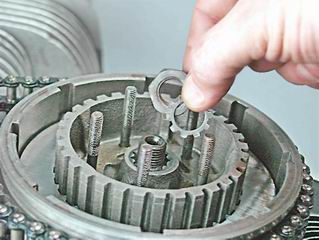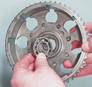 Шариковый подшипник барабана сцепления должен вращаться плавно. без шума и заеданий. Заметного люфта не должно быть. Изношенные и поврежденные детали заменяем. Установка и сборка Устанавливаем все детали в обратной последовательности, при этом смазанный моторным маслом подшипник запрессовываем в барабан легкими ударами по наружному кольцу через проставку (инструментальную головку).