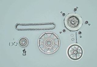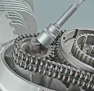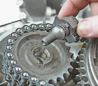 Болт звездочки и гайку барабана затягиваем рекомендуемым моментом. Не забываем законтрить болт отгибной шайбой! После сборки передачи, пока крышка картера еще не закрыта проворачиваем моторную передачу за заднее колесо, проверяя правильность сборки. Для облегчения вращения коленчатого вала открываем клапан декомпрессора. Цепь должна обкатываться по звездочкам плавно, без щелчков и рывков. Установив крышку, заливаем масло в картер, если оно сливалось. |