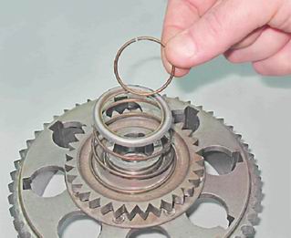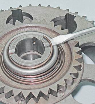 16. Отверткой поддеваем пружинное кольцо храпового механизма.