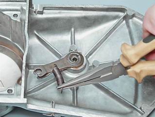 Привод сцепления - разборка и сборкаПривод сцепления приходится разбирать для его промывки и смазки. Работа показана на примере винтового (червячного) привода сцепления. Разборка 1. Снимаем правую крышку картера силового агрегата и выводим бобышку троса сцепления из рычага. 2. Отсоединяем пружину рычага от крышки картера.