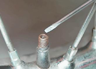 Шины - проверка состояния и регулировка давленияПеред каждым выездом следует проверять давление в шинах шинным манометром и, при необходимости, доводить его до нормы (см. п. 1.1). Пониженное и повышенное давление приводит к ускоренному износу шины, ухудшению управляемости мотоцикла. В жару, под прямыми солнечными лучами шина нагревается, и давление в ней возрастает. Избыточное давление можно сбросить, нажимая на стержень золотника тонкой отверткой.