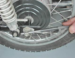Заднее колесо - снятие и установкаСнимать заднее колесо приходится для замены шины, тормозных колодок сальника или подшипников колеса. Снятие 1. Устанавливаем мотоцикл на центральную подставку. 2. Снимаем левый глушитель (при двухтрубной выпускной системе). 3. Удерживая ось воротком или другим подходящим стержнем ключом на 24 мм отворачиваем гайку оси колеса (резьба левая).