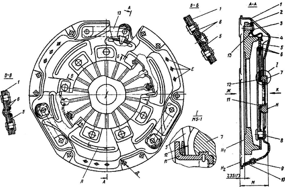 Рис. 57. Нажимной диск сцепления с кожухом в сборе: 1 - кожух сцепления; 2 - нажимной диск сцепления; 3 - заклепка; 4 - соединительное звено; 5 - нажимная пружина; 6 - опорное кольцо; 7 - опорная пята; 8 - стяжной палец; 9 - заклепка крепления балансировочного грузика; 10 - балансировочный грузик; 11 - центральная втулка; 12 - пружинное коническое кольцо; 13 - соединительная пластина; E - отверстия для установки балансировочных грузиков После установки и при надежном закреплении кожуха с нажимным диском в сборе (узел 412-1601090) на плоской плите, заменяющей маховик двигателя, с подложенной под нажимной диск проставкой-кольцом [Вместо проставки-колъца используйте три распорные шайбы толщиной 7,35 мм, равнорасположенные по окружности.] толщиной "Г" - 7,35 мм (рис. 57), проверьте следующее: 1. Радиальное биение рабочей поверхности "Н" опорной пяты, замеренное на диаметре 50 мм, не должно быть более 0,38 мм общих показаний индикатора. В случае необходимости для уменьшения биения пяты допускается нажатие или удар в районе одной из трех площадок "Л" кожуха сцепления. 2. Размер "М" должен быть в пределах 46,5-49,5 мм. 3. При перемещении поверхности "Н" опорной пяты в направлении стрелки "К" на 7,1 мм, отход поверхности "Н1" нажимного диска в направлении стрелки "Ж" должен быть не менее 1,27 мм. 4. При приложении к поверхности "Н" опорной пяты нагрузки в направлении стрелки "К" и отходе поверхности "Н1" нажимного диска от поверхности "Н2" на 7,9 мм биение поверхности "Н1" не должно превышать 0,25 мм. Замер биения и отхода нажимного диска производите с помощью индикаторов, штифты которых установлены на головки заклепок в местах крепления к нажимному диску соединительных звеньев, как показано на рис. 58.
