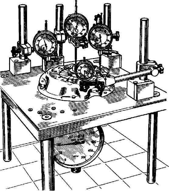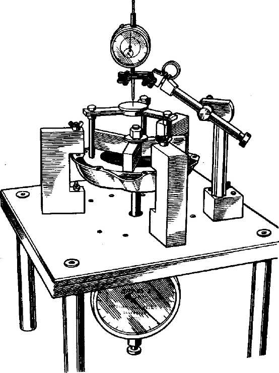 Рис. 58. Замер биения и отхода нажимного диска 5. Усилие, необходимое для перемещения поверхности "Н" пяты в направлении стрелки "К" (см. рис. 57) на величину 7,1 мм, должно быть не более 804 Н (82 кгс). При замере рабочего усилия на нажимном диске закрепите его на плоской плите, как показано на рис. 59.