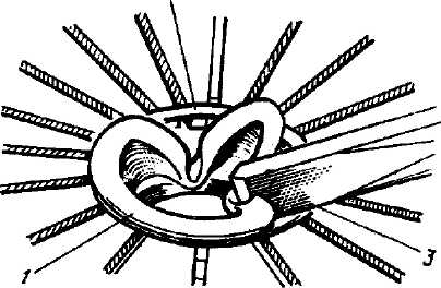 Рис. 60. Удаление центральной втулки крепления опорной пяты: 1 - центральная втулка; 2 - пружинное кольцо; 3 - зубило Для замены изношенной опорной пяты 7 и кольца 12 удалите центральную втулку крепления пяты, как показано на рис. 60, деформировав фланец центральной втулки 1 с помощью молотка и зубила 3. Для предупреждения повреждения во время удаления втулки опорной пяты и других деталей сцепления поместите опорную пяту в фиксирующую оправку ремонтного инструмента подобно тому, как показано на рис. 61. При наличии токарного станка срежьте упорный фланец центральной втулки 11 (см. рис. 57) резцом.
