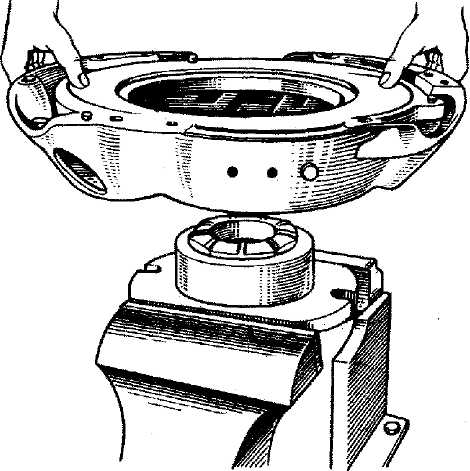 Рис. 59. Замер рабочего усилия на нажимном диске Усилие, необходимое для перемещения поверхности "Н1" (см. рис. 57) нажимного диска в направлении стрелки "Ж" до положения, определяемого размером "Г", не должно быть менее 3330 Н (340 кгс). При определении рабочего усилия на нажимном диске необходимо, чтобы шток пресса опускался до тех пор, пока усилие перестанет уменьшаться, а потом начнет повышаться. Затем, снижая нагрузку, приподнимите шток пресса до положения нажимного диска, соответствующего размеру "Г" = 7,35 мм (см. рис. 57), и зафиксируйте при этом действительную нагрузку. Ход нажимного диска замеряется индикатором. Если полученные при контроле значения проверяемых параметров не соответствуют указанным нормам, то замените кожух сцепления в сборе. ЗАМЕНА ОПОРНОЙ ПЯТЫ Опорная пята 7 (см. рис. 57) с нажимной пружиной 5 удерживается в собранном положении при помощи пружинного конического кольца 12 и центральной втулки 11. Втулка 11 после установки опорной пяты в прорези нажимной пружины вставлена до упора в буртик на внутреннем диаметре пяты и закернена в шести местах путем вдавливания центральной втулки 11 в радиальном направлении в канавку на внутренней поверхности пяты, как показано в выноске 1 (см. рис. 57). Пружинное коническое кольцо 12 за счет своей упругости выбирает осевые зазоры после сборки пяты с нажимной пружиной, а также компенсирует в определенных пределах износы контактных поверхностей этих деталей в процессе эксплуатации. При появлении значительных износов, которые уже не компенсируются упругостью пружинного конического кольца, либо при отпуске последнего по причине значительного нагрева рабочей поверхности пяты из-за нарушения правил эксплуатации автомобиля, происходит ослабление крепления пяты. Появление стука и дребезжания в сцеплении служит характерным признаком этого дефекта, который проявляется при работе сцепления как во время трогания с места, так и на ходу автомобиля.