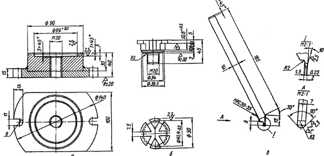 Рис. 64. Детали ремонтного инструмента для монтажа опорной пяты: а - основание; б - направляющая для закернивания; в - керн Установку опорной пяты производите в следующем порядке: - зажмите в тисках основание ремонтного инструмента с фиксирующей оправкой (см. рис. 61); - поместите опорную пяту плоским рабочим торцом вниз в фиксирующую оправку ремонтного инструмента. Смажьте тонким слоем смазки ЛСЦ-15 рабочие поверхности кончиков рычажков нажимной пружины и установите механизм сцепления на опорную пяту так, чтобы рабочая поверхность нажимного диска была обращена вверх, как показано на рис. 61. При этом обеспечьте, чтобы рычажки нажимной пружины располагались между выступами на радиусной поверхности пяты; - установите пружинное коническое кольцо 2 (рис. 65) вогнутой стороной к нажимной пружине и накройте его фланцем центральной втулки 1, вставив последнюю в отверстие нажимной пружины; - вверните направляющую 1 (рис. 66) для закернивания в основание приспособления до отказа, прижав центральную втулку 2 до упора в торец фланца опорной пяты; - с помощью керна 1 (рис. 67) закерните центральную втулку 2 в канавку на внутренней поверхности опорной пяты 5 в шести равномерно расположенных по окружности местах. Керн держите как можно точнее под углом 30° к горизонтали, как показано на рис. 67. Плоская часть керна при этом должна опираться на площадку направляющей.