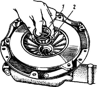 Рис. 65. Установка центральной втулки крепления опорной пяты и пружинного кольца: 1 - центральная втулка; 2 - пружинное коническое кольцо