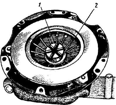 Рис. 66. Установка приспособления для закернивания центральной втулки при сборке: 1 - направляющая для закернивания; 2 - центральная втулка