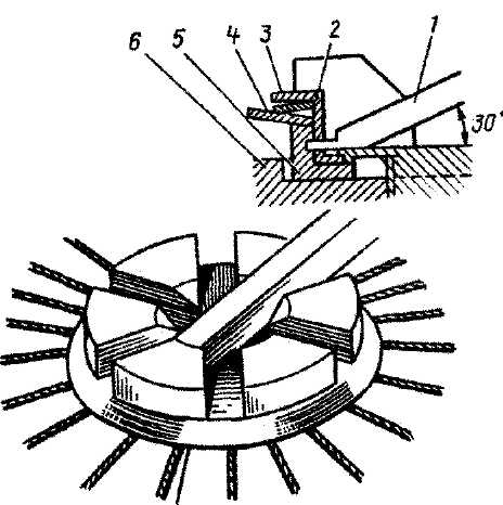 Рис. 67. Кернение центральной втулки при сборке: 1 - керн; 2 - центральная втулка; 3 - пружинное кольцо; 4 - диафрагменная пружина; 5 - опорная пята; 6 - фиксирующая оправка |